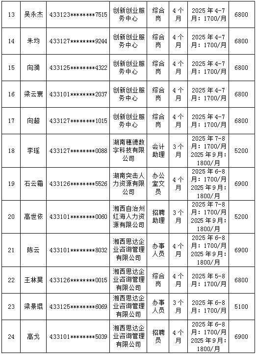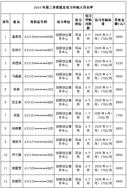 根据《关于实施三年3万青年见习计划的通知》(湘人社函〔2019〕86号)、《关于进一步推进实施就业见习岗位募集计划的通知》(湘人社函〔2023〕9号)、湘人社函[2022]59号文件规定,现将湘西高新技术产业开发区2025年第三季度及部分2025年二季度就业见习补贴申领明细进行公示(具体名单见附件)。