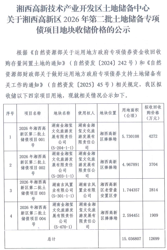 关于湘西高新区2026年第二批土地储备专项债项目地块收储价格的公示
