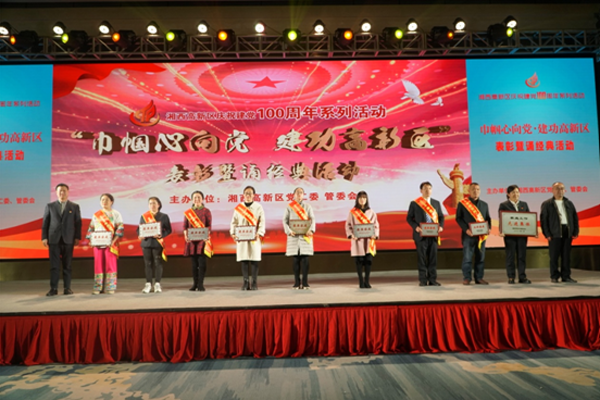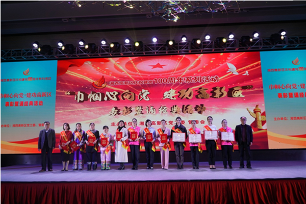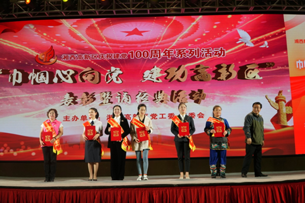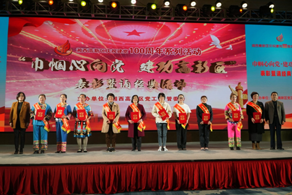 3月23日下午,湘西土家族苗族自治州湘西高新区庆祝建党100周年系列活动——“巾帼心向党、建功高新区”民族文化进园区经典诗词朗诵暨巾帼表彰活动在湘西高新区隆重举行。湘西高新区党工委书记陈晓龙,湘西高新区党工委副书记、管委会主任陈文君,湘西高新区党工委副书记戴晓军,湘西高新区党工委委员、管委会副主任皮丕军、杨宏呈等参加活动并为优秀爱心妈妈、优秀巾帼志愿者、最美家庭等个人和集体颁奖。
