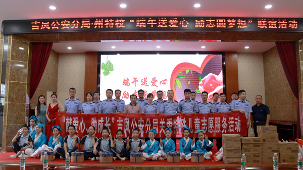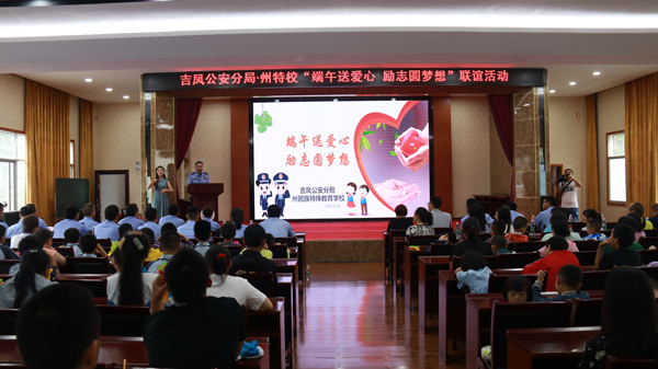 为推动公安队伍思想道德建设,进一步增强民辅警社会服务意识,关心关爱特殊学生,让特殊学生体验到人与人之间的平等、尊重、信任与友善,帮助他们形成积极的、向上的人生态度和情感体验,促进特殊学校学生健康成长。端午节来临前夕,6月24日上午,吉凤公安分局局长毛冲带领分局30余名民警、辅警志愿者走进湘西州特殊教育学校开展“关爱特殊儿童,构建和谐社会”志愿服务活动,并将慰问品送到孩子们手中,为他们送去了节日的祝福。