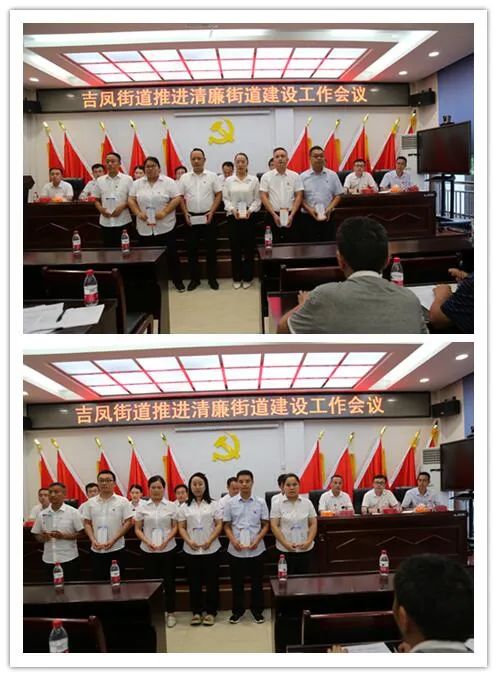 会议组织全体人员观看《永远在路上》第六集《拍蝇惩贪》警示教育片,宣读了《吉凤街道社区“小微权力”清单制度工作方案》《吉凤街道关于推进清廉建设工作的实施方案》,组织街道、社区全体干部集中签订了《吉凤街道为民服务十必须十不准承诺书》《吉凤街道优化营商环境九严禁九到位承诺书》《不操办不参与“升学宴”“谢师宴”承诺书》,并为街道站办所、社区发放《吉凤街道清廉警示宣传手册》。