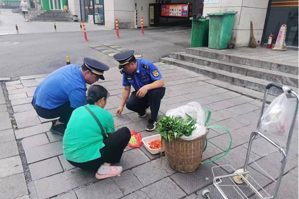 7月18日上午,在丰达路溶江小区的人行道上,一个流动摊贩为了躲避城管执法,急忙把蔬菜收拾进背篓以便逃离。但摊主没掌握好平衡,菜叶和豆子洒了一地。高新区执法大队队员们了解情况后,立即帮小贩收拾起地上的物品。随后执法大队大队长依法对小贩进行了批评教育。小贩很受感激,一再表示要守法经营。