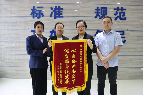5月31日下午,湘西碧桂园房地产开发有限公司相关负责人将一面写着“心系企业办实事,优质服务促发展”的锦旗送到高新区行政审批办,感谢为解决公司项目报建审批提供的指导帮助以及提供的优质、高效服务。