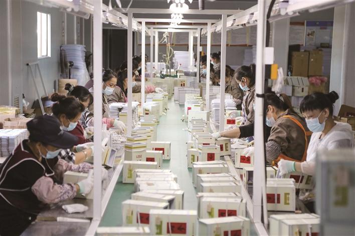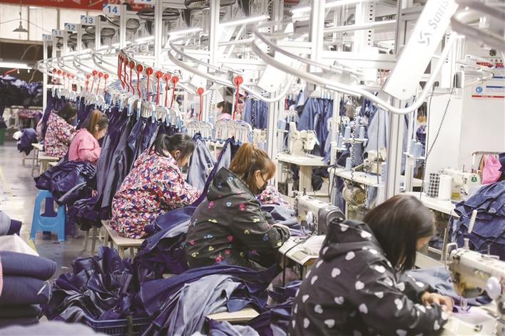 2021年12月14日,湖南湘西高新区索雅特服装有限公司生产车间内,工人在加工服装。