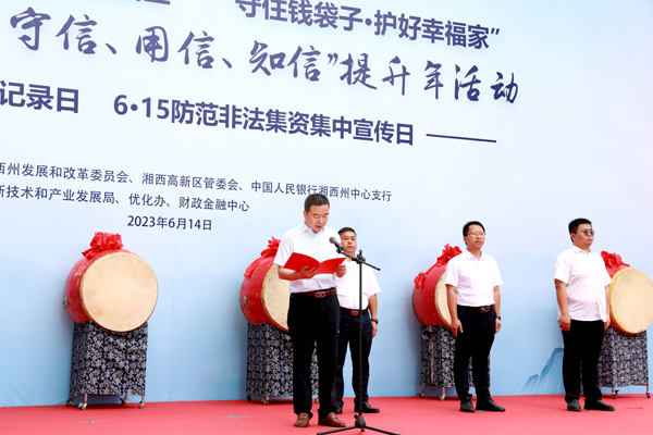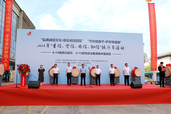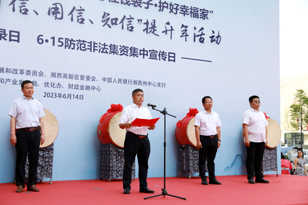 6月14日,州发改委、湘西高新区管委会、中国人民银行湘西州中心支行等单位联合举办“6·14信用记录日”“6.15防范非法集资集中宣传日”主题宣传活动,弘扬诚信文化,建设诚信园区,号召广大群众“守住钱袋子,护好幸福家”,警惕防范非法集资。