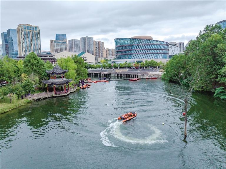 10月13日,湘西高新区文化广场湾溪河水域,消防救援人员在进行水上救援比武。当天,州消防救援支队举行(离心力)舟艇快速救援操竞赛,模拟复杂水域下的救援任务,围绕操作充气式动力艇、旋转S型过障碍物、水上救援等课目进行强化训练,全面提升消防救援人员舟艇操作技能及水上应急救援综合能力。