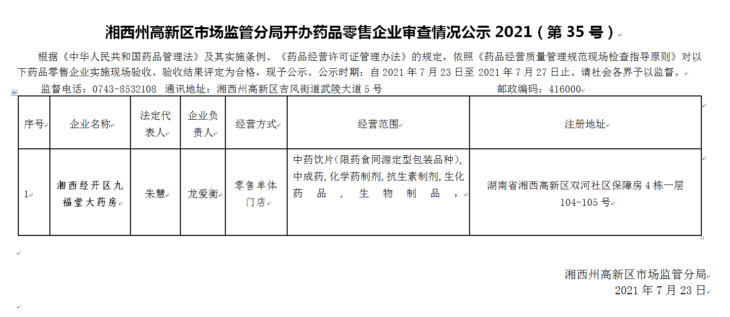 湘西州高新区市场监管分局开办药品零售企业审查情况公示2021(第35号)-湘西高新技术产业开发区