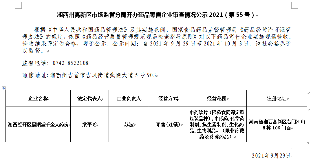 湘西州高新区市场监管分局开办药品零售企业审查情况公示2021(第55号)-湘西高新技术产业开发区