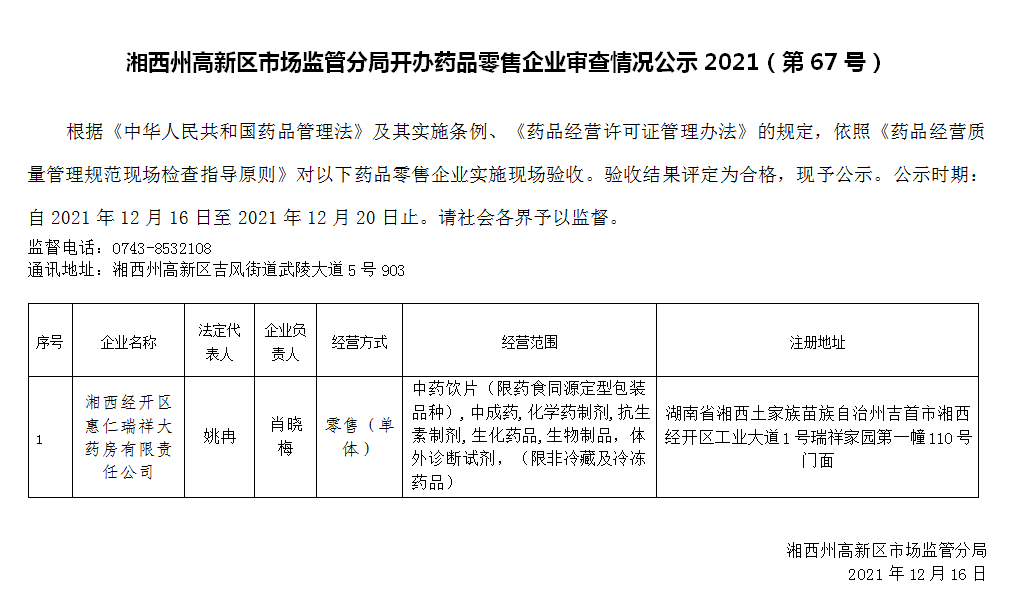 湘西州高新区市场监管分局开办药品零售企业审查情况公示2021(第67号)