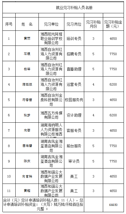根据《关于实施三年3万青年见习计划的通知》(湘人社函〔2019〕86号)与湘人社函[2022]59号文件规定,现湘西阳光阿娅职业培训学校有限公司1人、湘西自治州红海人力资源有限公司3人、湘西自治州金泰科技有限公司1人、湘西五方传媒有限公司1人、湖南海纳明人人力资源服务有限公司湘西分公司1人、湖南吉凤金湘玺酒店有限公司2人、湘西和谐云大数据产业发展有限公司2人享受2022年第四季度就业见习补贴情况进行公示(公示名单见附件)。