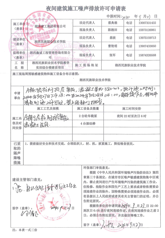 夜间建筑施工噪声排放许可申请公示(湘西职院实训综合楼)-湘西高新技术产业开发区