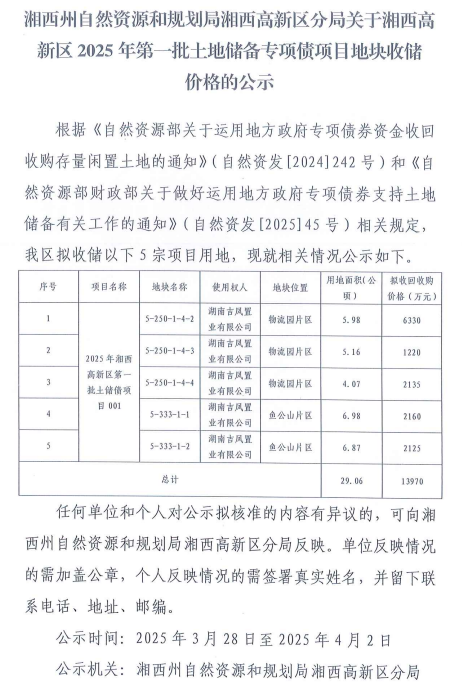 关于湘西高新区2025年第一批土地储备专项债项目地块收储价格的公示