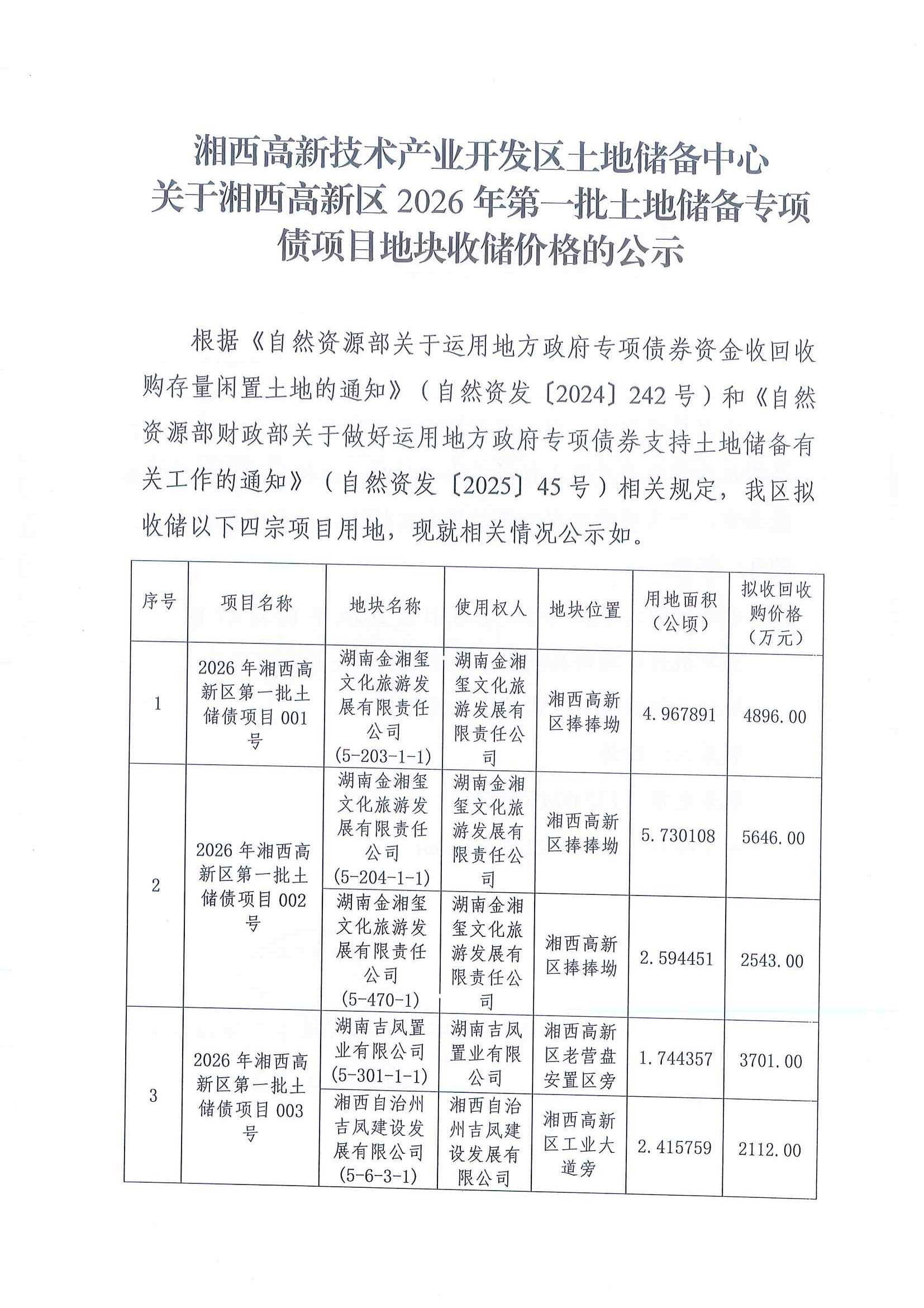 关于湘西高新区2026年第一批土地储备专项债项目地块收储价格的公示