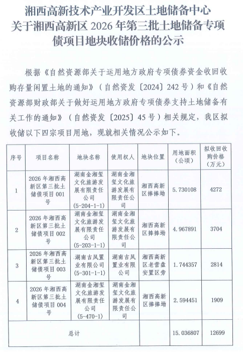 关于湘西高新区2026年第三批土地储备专项债项目地块收储价格的公示